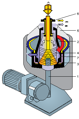 El diesel a centrifugar, entra (A) pasando a través del distribuidor (3) al interior del tazón, el cual está montado en el eje vertical (1) y es donde se efectúa la centrifugación por acción de la fuerza centrífuga. |